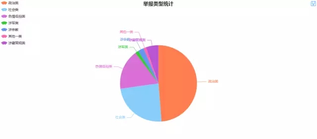 综合分析月举报情况,政治有害类信息占比48.76%,仍然是本月受理最多的举报信息;其次为社会民生类举报信息占比24.03%;网络色情低俗庸俗有害信息有所回落,仅占比16.96%。