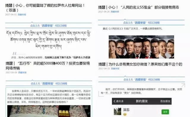 4月份,“这个月起车上没灭火器将扣分”“拉萨出现禽流感病例”“昌都一超市买到塑料紫菜”“净土公司直销点买到劣质午餐肉”“拉萨市一旅游车辆车身标识藏英文翻译错误”“西藏退伍军人可领退役补助”等信息在微信朋友圈、微博、等平台流传,我中心多方面进行核查,并视情况分别撰写了辟谣、反馈文章。