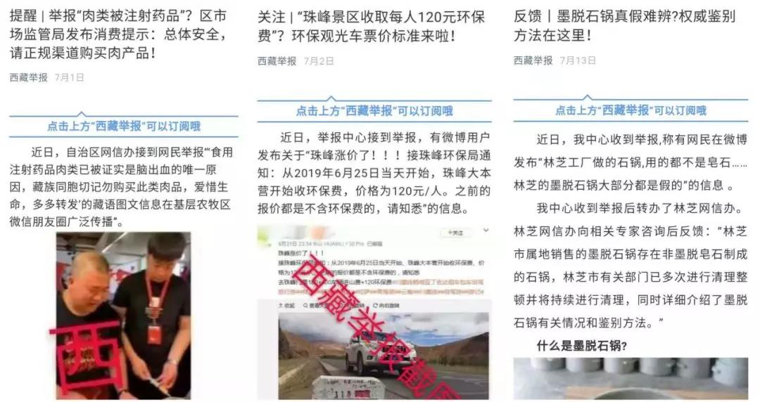 针对“肉类被注射药品?”“珠峰景区收取每人120元环保费?”“墨脱石锅真假辨?”等信息,我中心及时与有关部门进行对接核实,并通过“西藏举报”网站、微信公众号、微博账号及一点资讯平台发布相关反馈或辟谣信息。