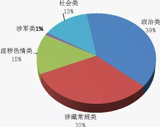 本月受理的各类举报信息中,政治类有害信息占39%,涉藏常规类有害信息占32%,淫秽色情类有害信息占15%,社会类有害信息占13%,涉军类有害信息占1%。