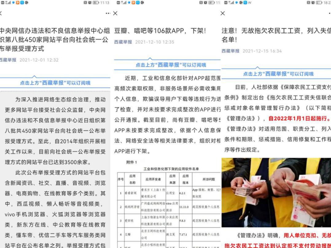 针对“中央网信办违法和不良信息举报中心组织第八批450家网站平台向社会统一公布举报受理方式”“豆瓣、唱吧等106款APP,下架”“2022年1月1日起施行,无故拖欠农民工工资,列入失信名单”等信息,我中心及时通过“西藏举报”网站、微信公众号、微博账号发布、转发相关反馈或辟谣文章。
