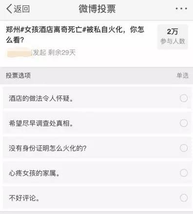 而另一家门户网站的河南分站,还在这条问题新闻的基础上发起了一个更加“偏颇”的投票,问大家怎么看这件事。其中五个选项每一个都是在将不明真相的群众的怒火,引向酒店和警方的...