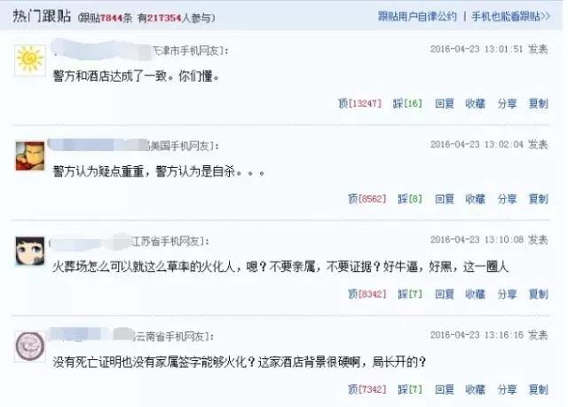 结果,在这些不负责任的媒体扑天盖地的转发报道之下,众多网友被纷纷误导。在每个门户网站所转发的这条新闻下面,网友们几乎都在大骂酒店和警方,还有一些“脑洞大开”的网友编造出了“警方如何与酒店勾结杀害无辜女子”的谣言。