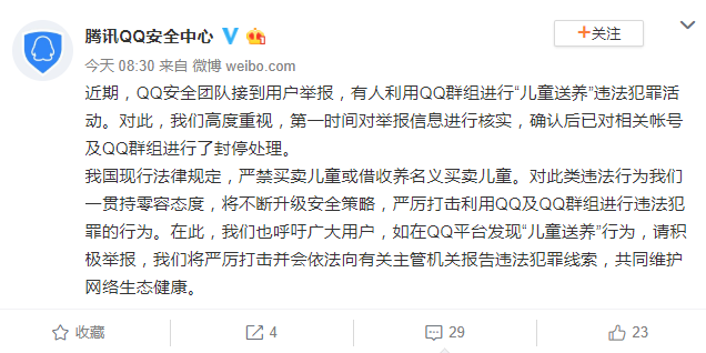 4月14日,腾讯发布声明称,针对用户举报的有人利用QQ群组进行“儿童送养”违法犯罪活动,已对举报信息进行核实并对相关账号及QQ群组进行了封停处理。