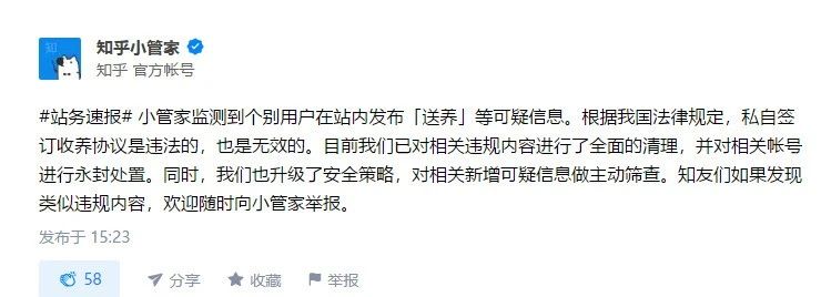 知乎于4月13日作出回应称,已对“儿童送养”相关违规内容进行全面清理,并对相关账号进行永封处置。同时,也升级了安全策略,将对相关新增可疑信息做主动筛查。