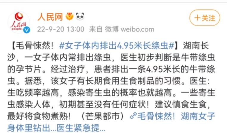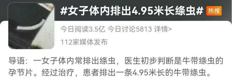 近日,一则“女子体内排出4.59米长绦虫”新闻登上热搜,不少网友称被吓到。