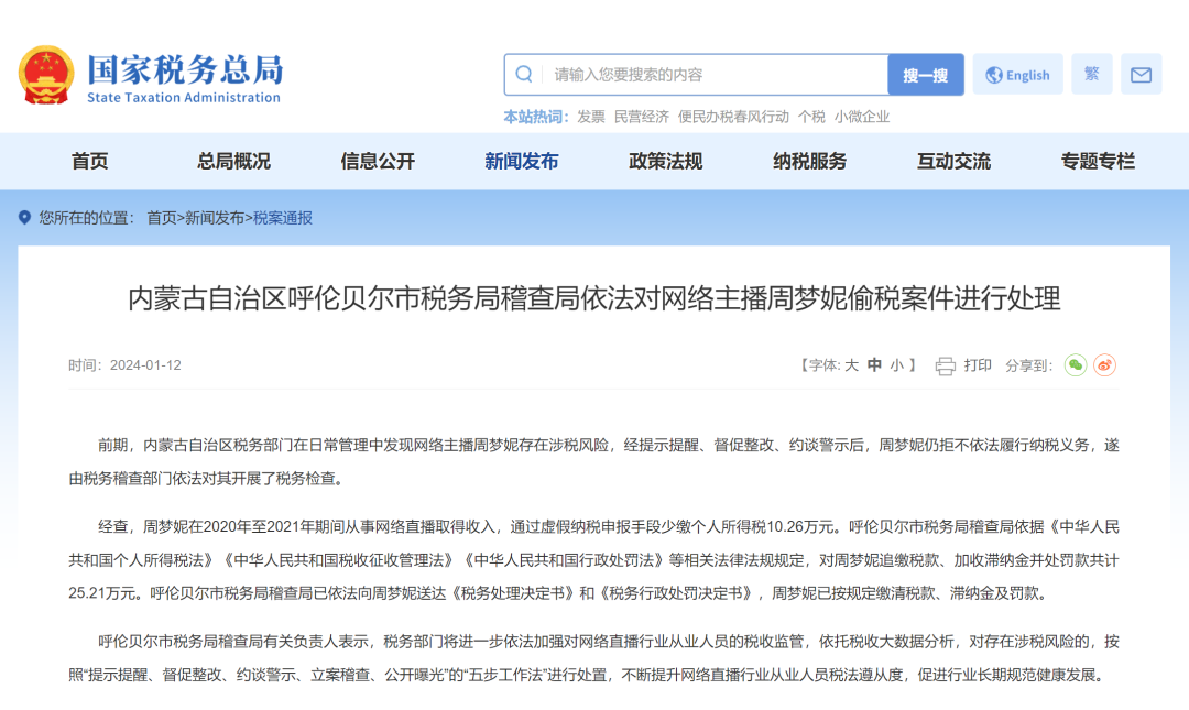 内蒙古自治区呼伦贝尔市税务局稽查局依法对网络主播周梦妮偷税案件进行处理