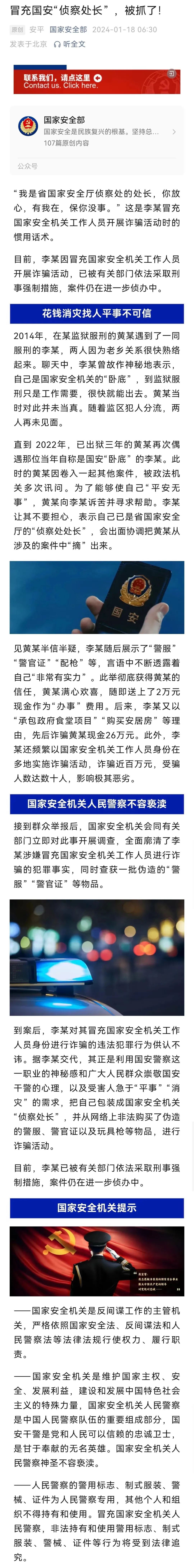 “我是省国家安全厅侦察处的处长,你放心,有我在,保你没事。”据国家安全部消息,这是李某冒充国家安全机关工作人员开展诈骗活动时的惯用话术。