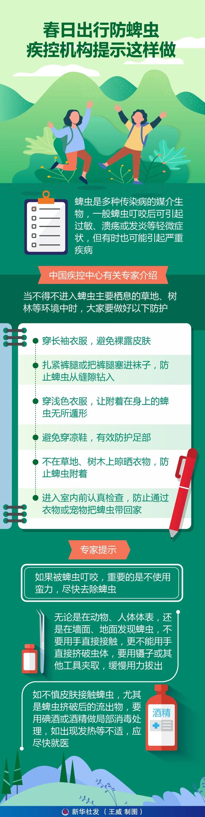 减少蜱虫的危害,预防为主。徐京杭建议,如果去野外露营、徒步,尽量穿长衣长裤,减少皮肤露出;衣物最好选择浅色,便于发现蜱虫;避免在蜱虫栖息地长时间坐卧;使用含有避蚊胺的防蚊液也能起到减少蜱虫叮咬的作用。在草丛、树林等地活动后,家长应重点检查孩子裸露在外的皮肤,耳后、脖子等也要仔细检查有没有新增的“小黑点”,避免蜱虫藏匿。(记者:林苗苗)