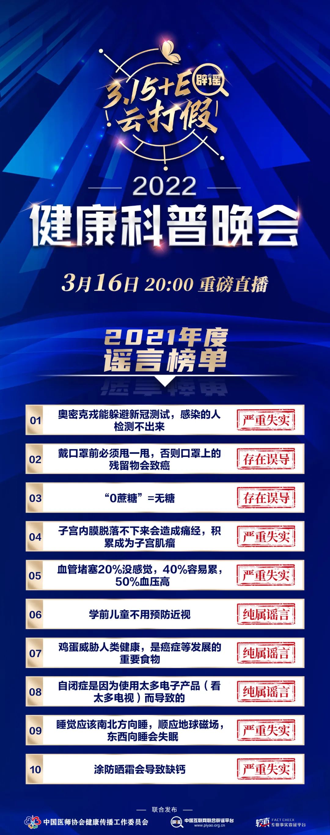 3月16日,中国互联网联合辟谣平台、中国医师协会健康传播工作委员会、腾讯较真平台在第三届“315+E”云打假健康科普晚会上联合发布“2021年度十大健康谣言榜单”。