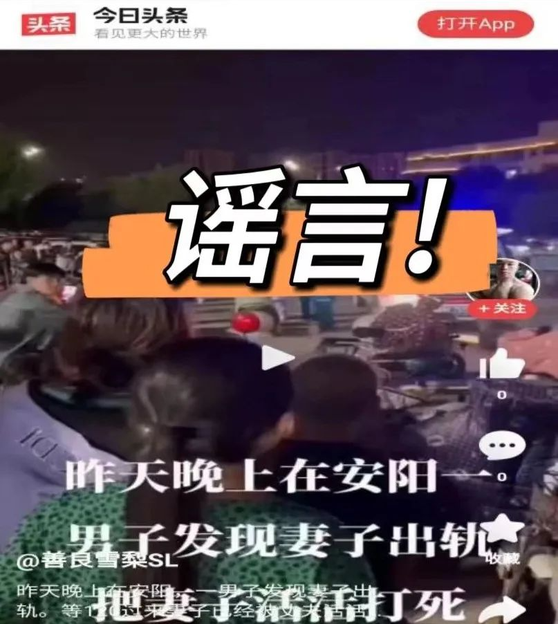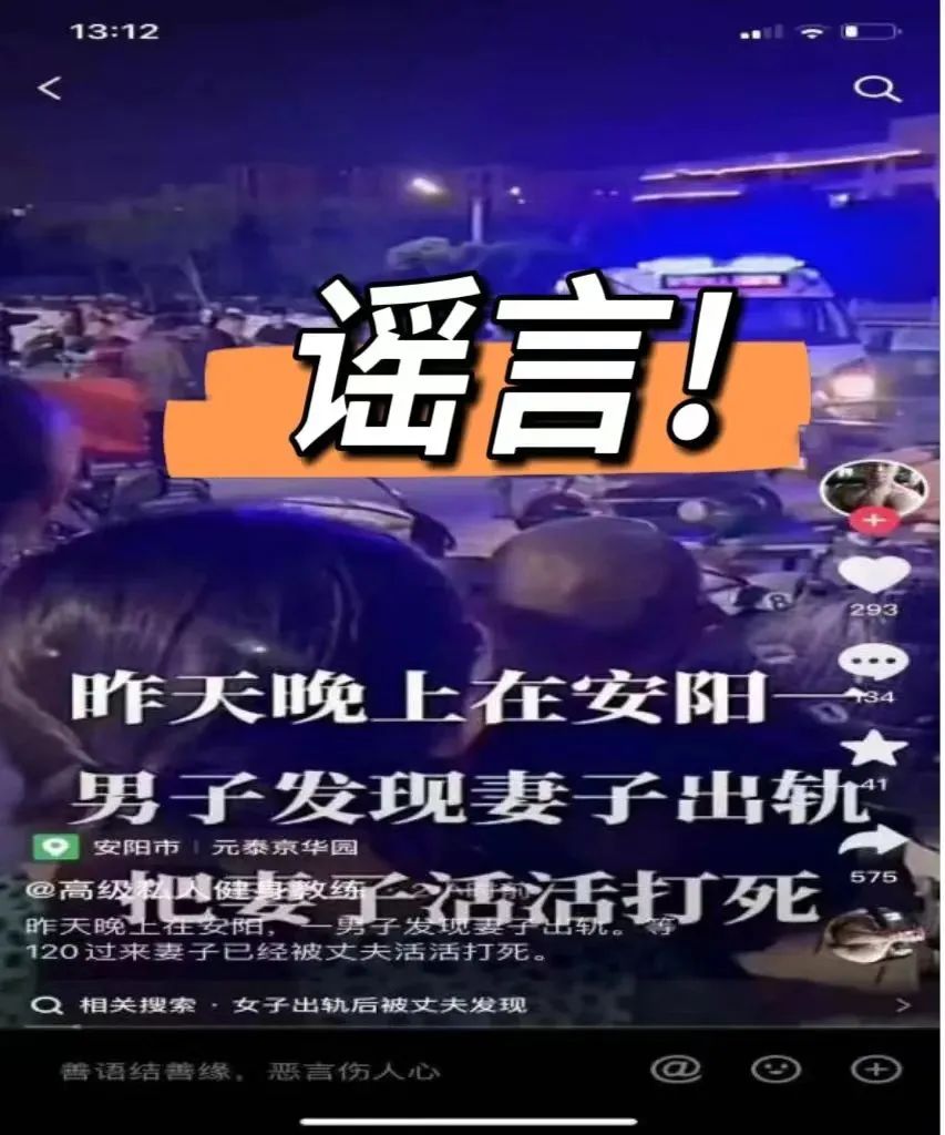 5月3日,河南安阳网警在工作中发现,有网民针对5月2日在安阳市某广场附近发生的一起案件发布视频,配文称“昨天晚上在安阳一男子发现妻子出轨,把妻子活活打死……”