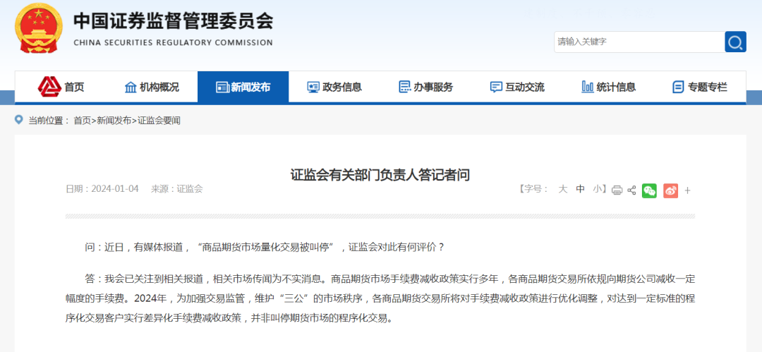 证监会有关部门负责人表示,已关注到相关报道,相关市场传闻为不实消息。商品期货市场手续费减收政策实行多年,各商品期货交易所依规向期货公司减收一定幅度的手续费。2024年,为加强交易监管,维护“三公”的市场秩序,各商品期货交易所将对手续费减收政策进行优化调整,对达到一定标准的程序化交易客户实行差异化手续费减收政策,并非叫停期货市场的程序化交易。