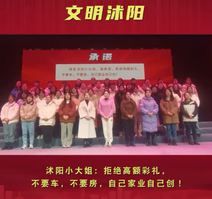 面对高价彩礼,多地出手了。2月10日,江苏沭阳县举办“沭阳小大姐”新时代文明婚恋倡导活动,倡议未婚女青年拒绝高价彩礼,把勤俭持家、艰苦创业作为见证爱情、砥砺人生的必修课,营造节俭文明的婚嫁新风。“小大姐”是沭阳方言中对未婚女性的称呼。