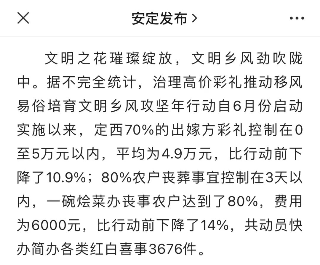 消息称,据不完全统计,治理高价彩礼推动移风易俗培育文明乡风攻坚年行动自2022年6月份启动实施以来,定西70%的出嫁方彩礼控制在0至5万元以内,平均为4.9万元,比行动前下降了10.9%。