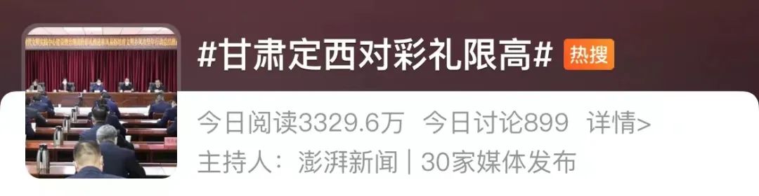 甘肃定西日前公布了治理高价彩礼行动方案的实施情况。据澎湃新闻报道,去年5月,当地出台的相关行动方案明确,婚嫁礼金不超过5万元,城区和农村举办婚事酒席均不超过20桌等。