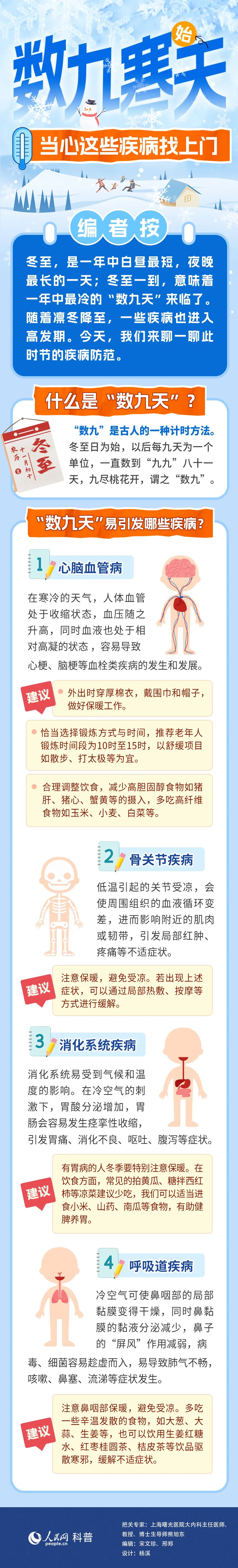 冬至,是一年中白昼最短,夜晚最长的一天;冬至一到,意味着一年中最冷的“数九天”来临了。随着凛冬降至,一些疾病也进人高发期。今天,我们来聊一聊此时节的疾病防范。