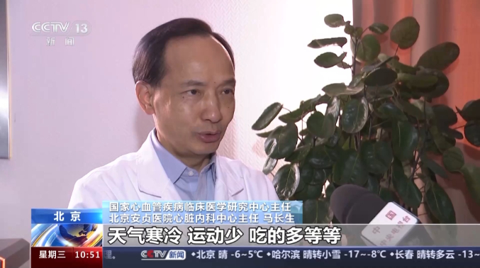 国家心血管疾病临床医学研究中心主任、北京安贞医院心脏内科中心主任 马长生:天气寒冷,运动少,吃的多等等,然后再加上一个心脏病的特色,就是血压更高,血液更黏稠。为什么更黏稠?他运动少,血液容易形成血栓,再一个血管受(炎症)这些刺激,我们叫炎症反应。就像人的状态不好一样,涉及心血管它整个状态也不好,这样容易出现的比如说冠状动脉血管痉挛,冠状动脉里面的血块、斑块破裂等等,包括心衰加重。