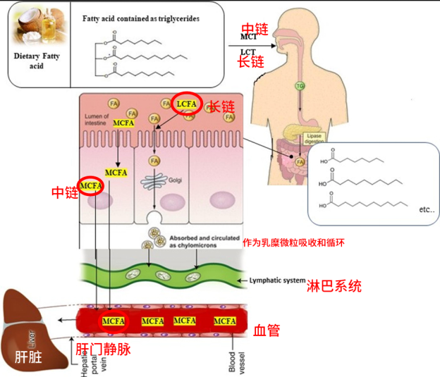 长链脂肪酸是个规矩的上班族,它被小肠吸收后,得先乘坐淋巴系统的公交车才能到达血液循环的地铁站。而中链脂肪酸则像是个潇洒的自行车骑手,直接就能骑上自行车进入血液循环的高速公路,省去了等公交的麻烦,自然就快多了。