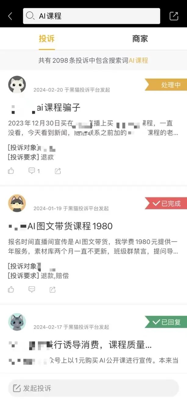 图片△黑猫平台关于AI课程的投诉