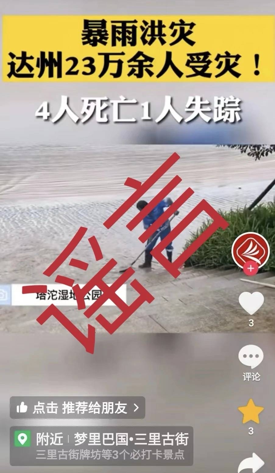 经核实,系李某某将往年视频内容修改嫁接成当前达州汛情,该内容为不实信息。