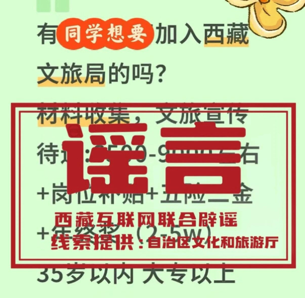 近日,在网络平台上,出现所谓“西藏文旅局”招聘信息,声称会提供“轻松稳定”“多地可选”的事业编制岗位。经核实,该信息内容不实,属虚假信息。